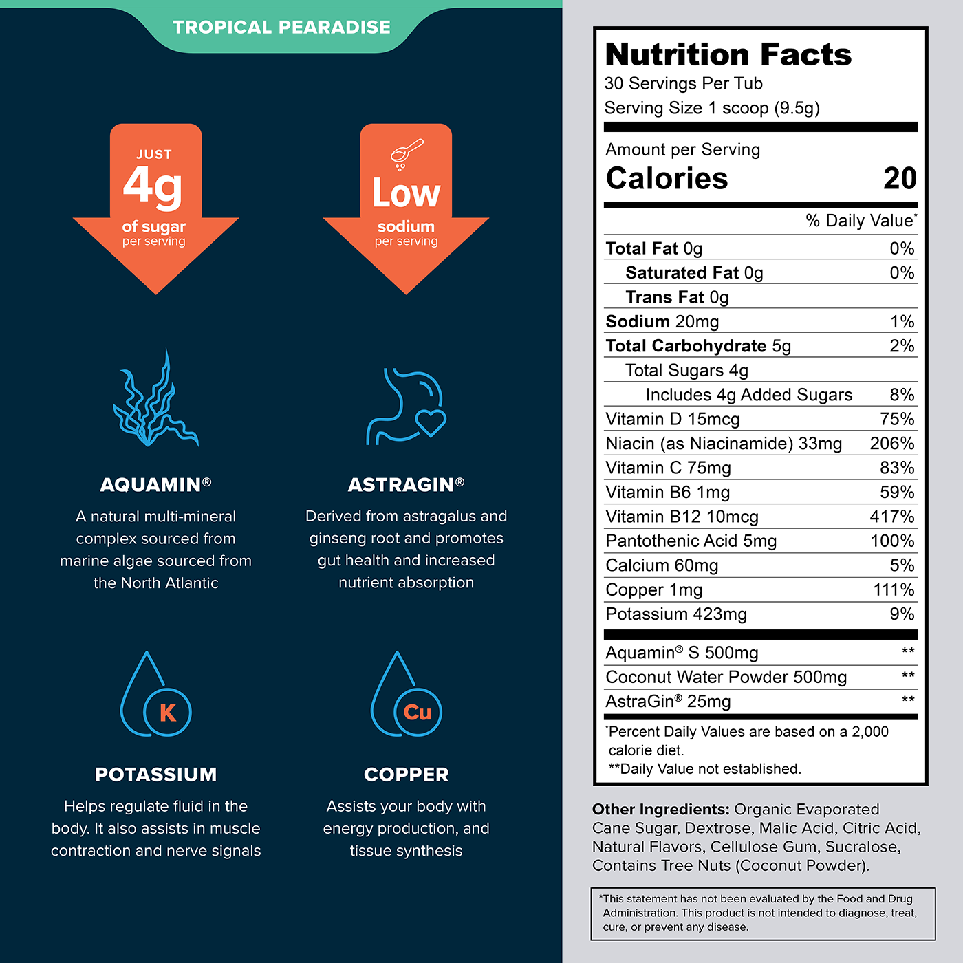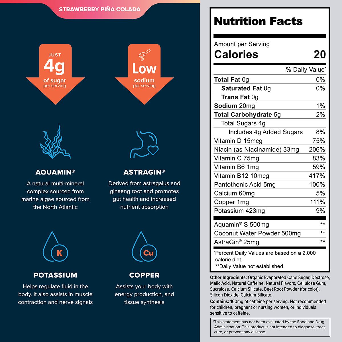 The main electrolyte ingredient we use is coconut water powder. The exact electrolyte content of coconut water powder can vary, but it contains high levels of potassium, as well as smaller amounts of other minerals such as magnesium, calcium, and sodium. These minerals are important for regulating fluid balance, muscle and nerve function, and other bodily processes.